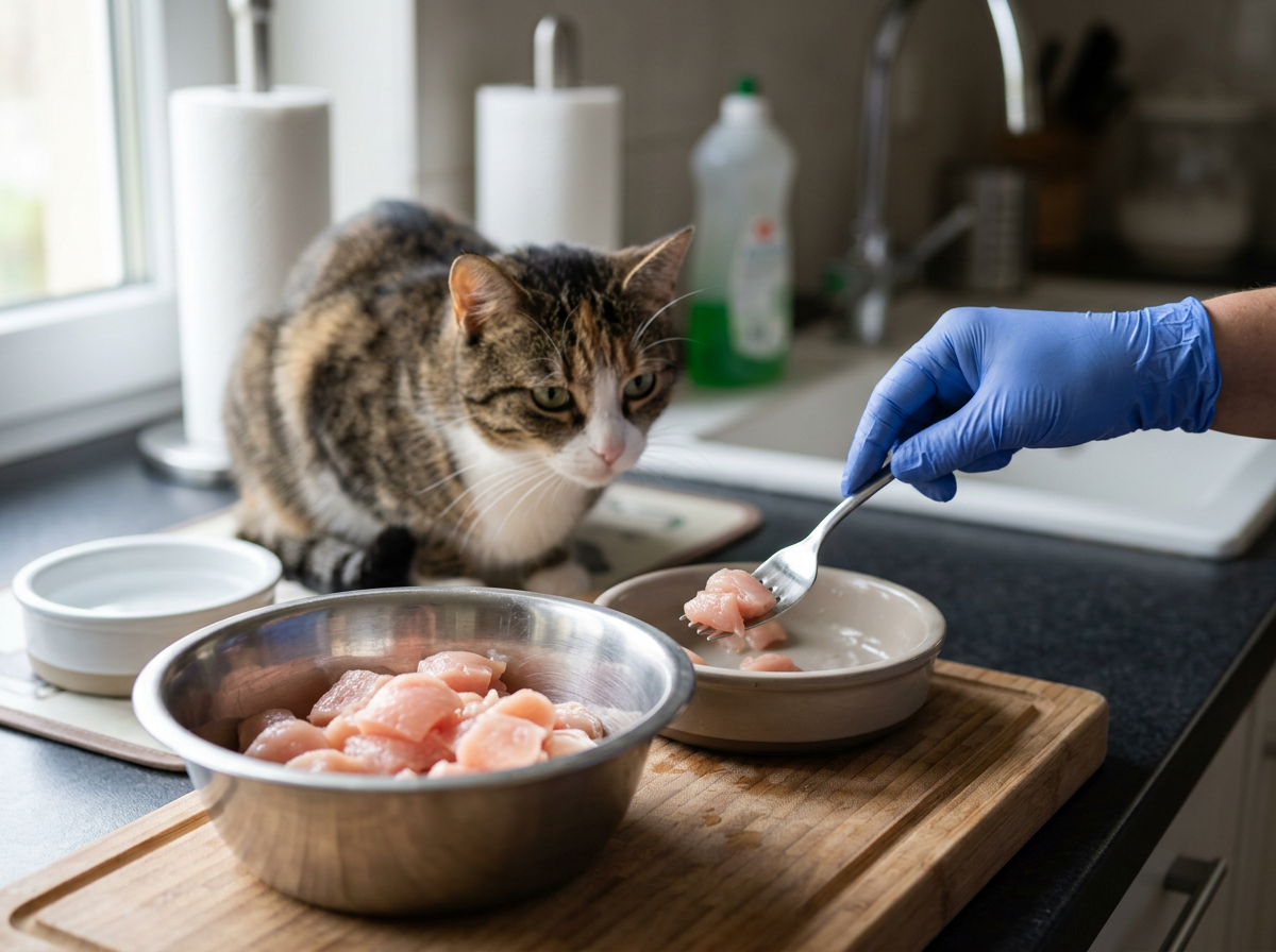 Wie lässt sich rohes Hähnchenfleisch für Katzen sicher zubereiten?